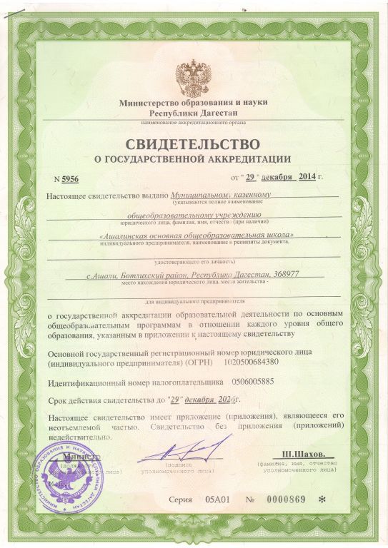 | Адрес местонахождения образовательной организации* | 368977 с.Ашали район Ботлихский РД |